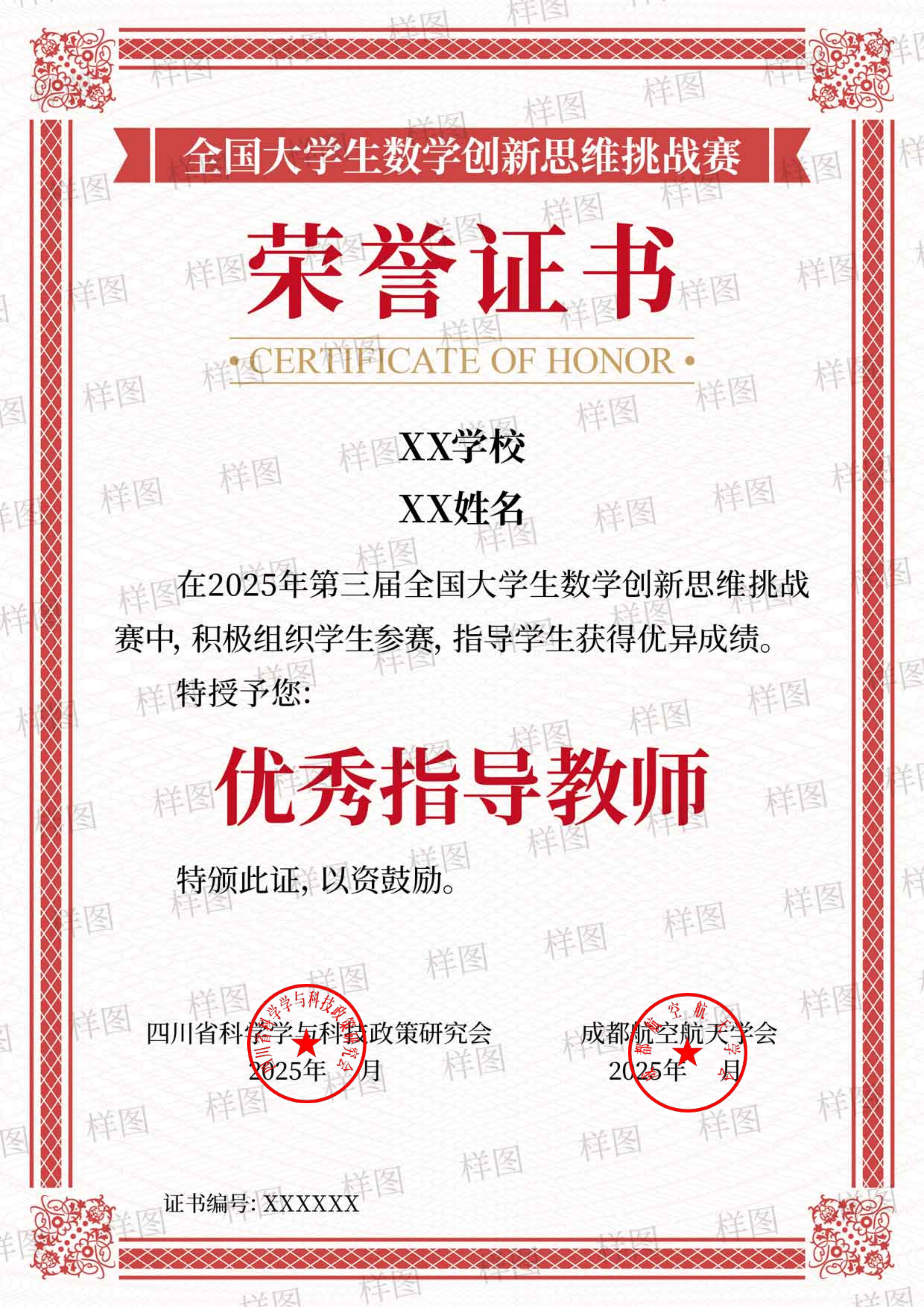 根据指导队伍得奖情况和组织参赛队伍数量综合评定,组织报名超过10人,颁发优秀指导教师荣誉证书。