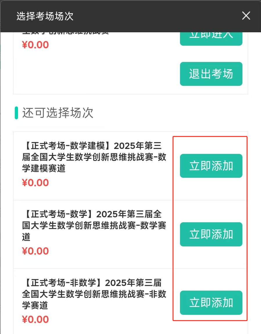 3、根据个人类别选择考场【数学建模类-正式考场】/【数学类-正式考场】/【非数学类-正式考场】,点击【立即添加】即可(考试分为数学建模类、数学类和非数学类,每个人仅可选择一个正式考试)。