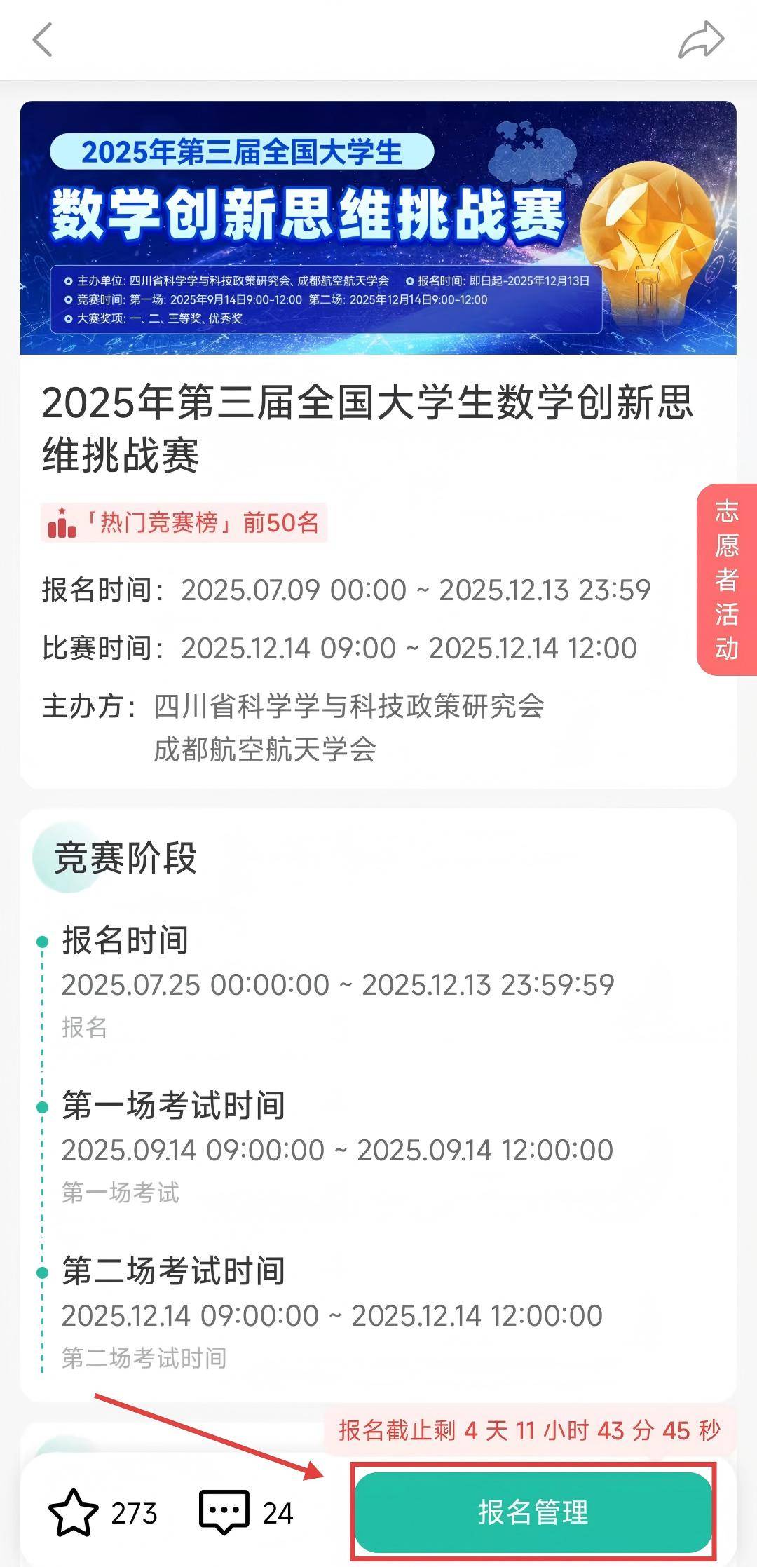 1、进入大赛官网:https://new.saikr.com/vse/math2025 ,登录账号,找到2025年第三届全国大学生数学创新思维挑战赛,点击【报名管理】。