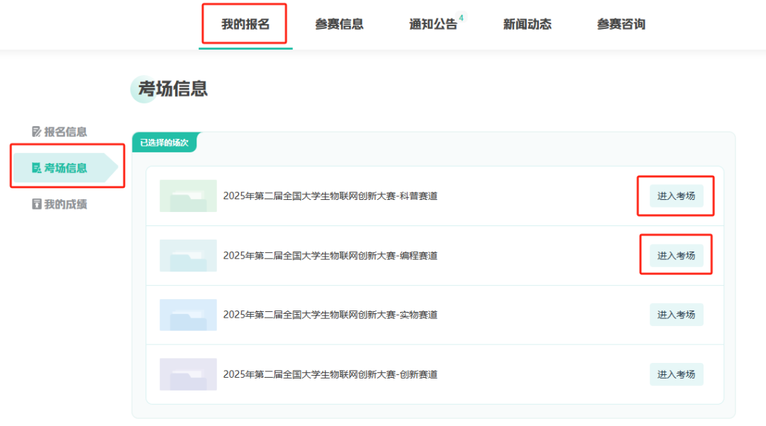 二、在【我的报名】中找到【考场信息】,找到已报名的考试赛道点击进入考场。
