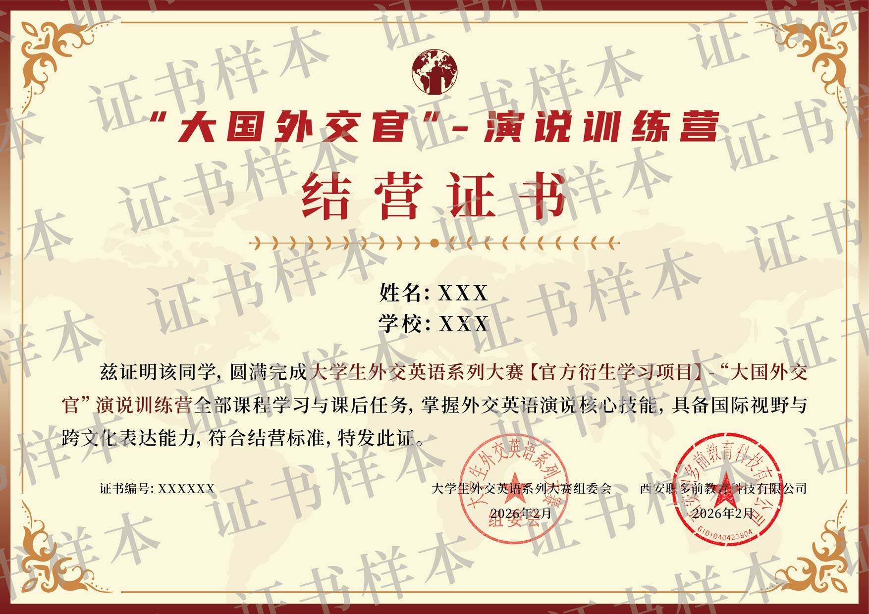 证书由外交英语系列赛事组委会指导,联合企业/院校(共建单位征集中,本期由大学生外交英语系列大赛组委会、西安职多前教育科技有限公司盖章)共同认证,可作为高校综测、实习求职的官方能力证明。
