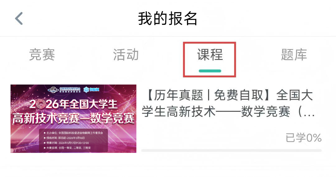【第二步】:在【我的课程】一栏选择【全部课程】,点击“【历年真题 | 免费自取】全国大学生高新技术——数学竞赛(资料仅供学习)”
