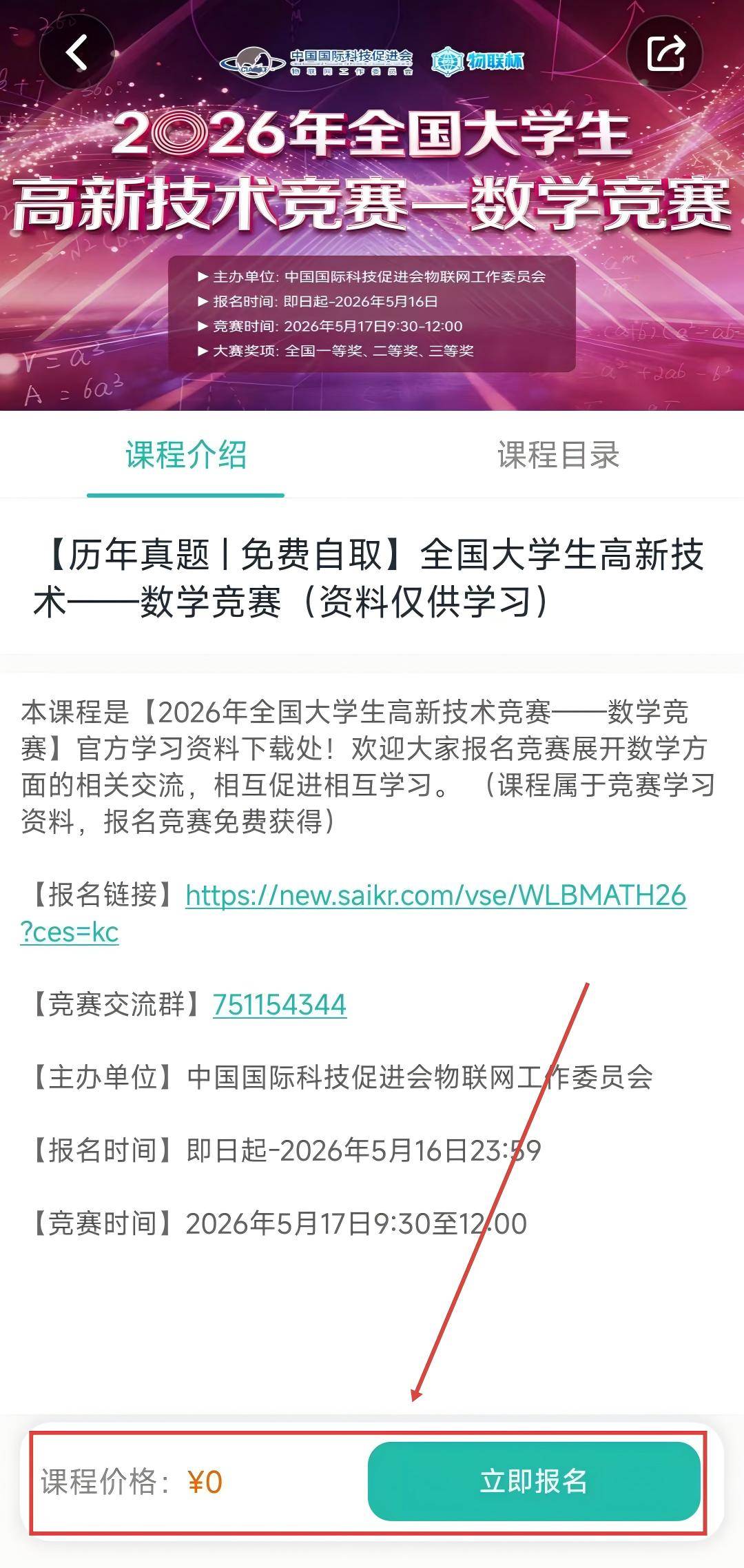 【第三步】:课程在报名竞赛后可以免费领取,在课程页面点击【0元报名】