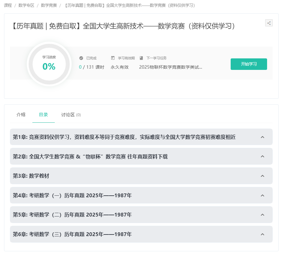 竞赛专属学习资料现已发布,包含全国大学生高新技术竞赛数学竞赛历年真题解析、全国大学生数学竞赛历年赛题详解、考研数学1987-2025全部真题、数学视频课等,报名即可免费领取,各位同学可自行前往课程下载观看,作为练习提升使用。