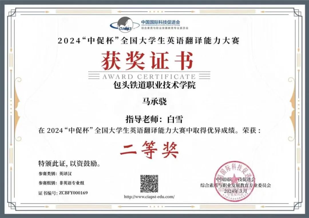 近日,学院铁道工程系铁道工程技术2358班马承骁同学在白雪教师指导下,成功斩获2024“中促杯”全国大学生英语翻译能力大赛二等奖,展现出优秀的英语翻译实力和比赛技巧,为学院争光添彩。该项比赛由中国国际科技促进会综合素质与职业发展教育专业委员会主办,是全国范围内具有重要影响力的英语翻译赛事,吸引了众多优秀大学生的参与。