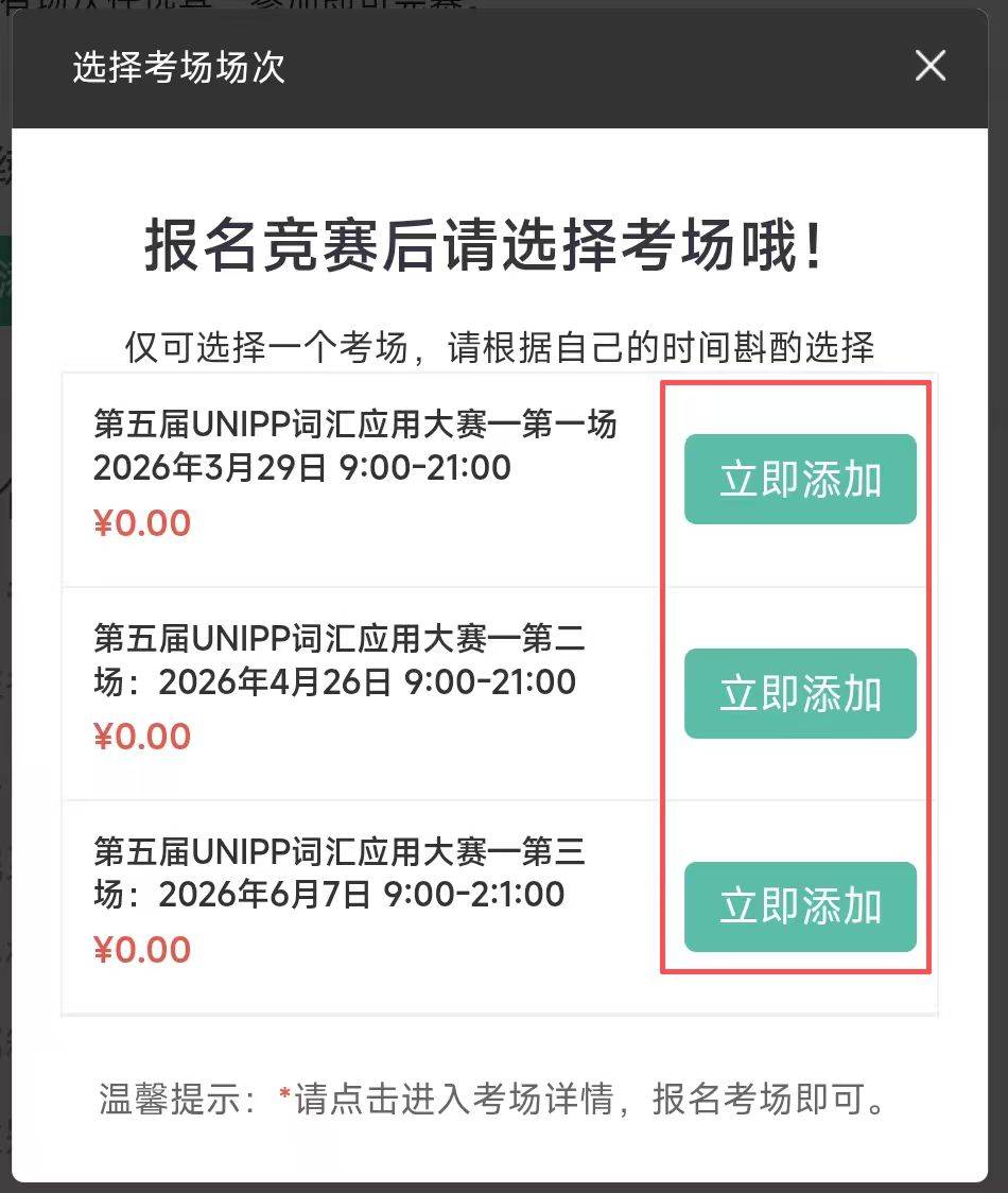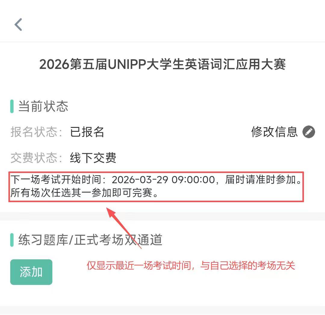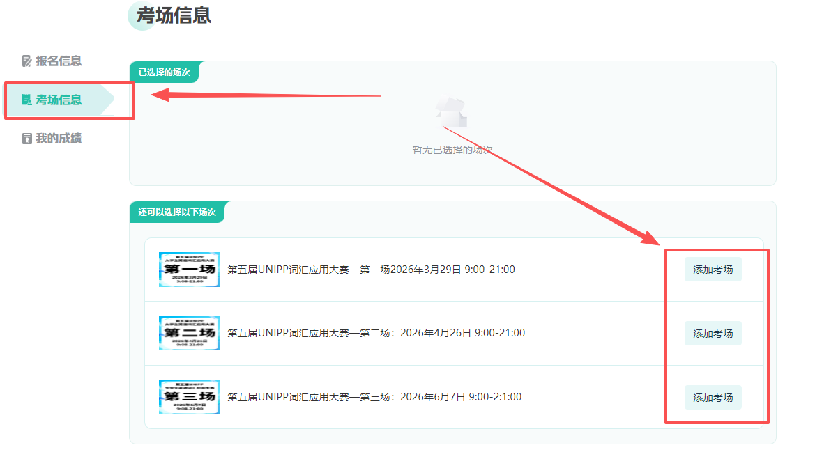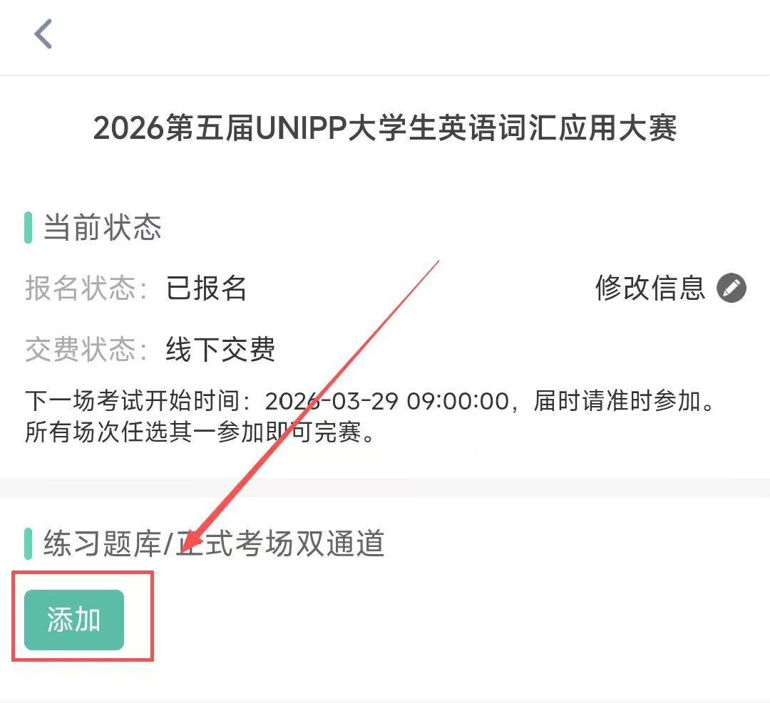 登录已报名的账号→右下角 我的 页面点击【报名】→点击赛事页面,点击右下角【报名管理】→点击【添加】选择合适时间的考场