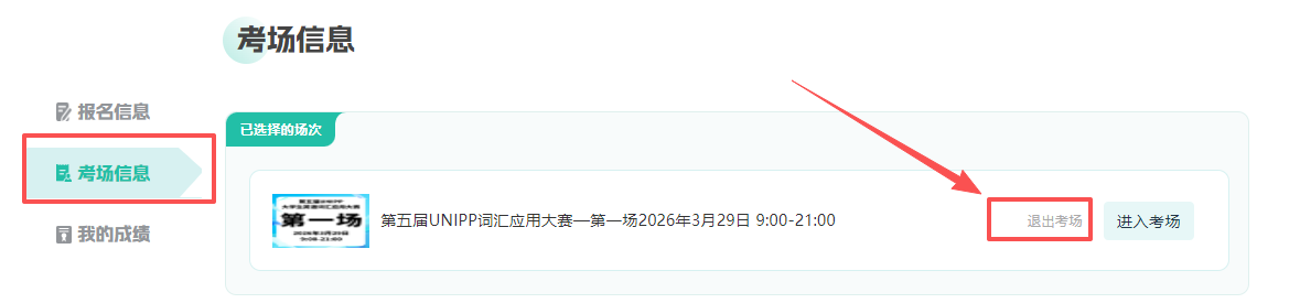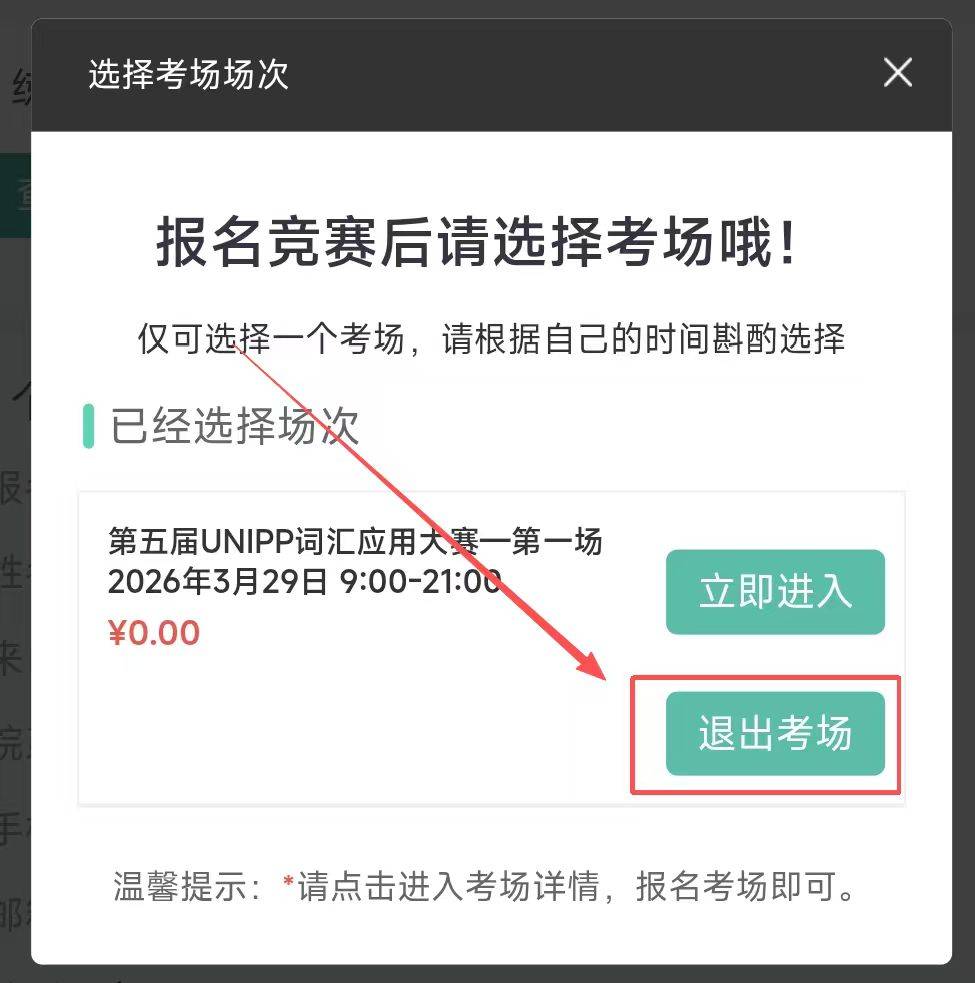 登录已报名的账号→右下角 我的 页面点击【报名】→点击赛事页面,点击右下角【报名管理】→点击【查看】退出考场,再重新选择即可