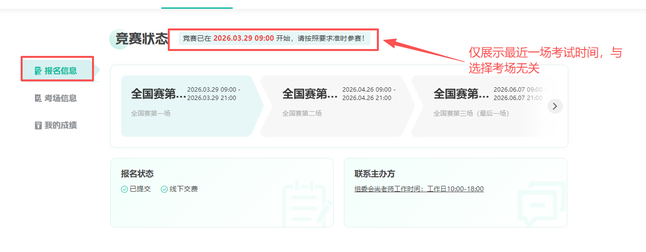 【注意】已结束考试的考场无法自主修改、考试当天的考场无法自主修改,以上两种情况需联系组委会老师修改。(微信:13752476374)
