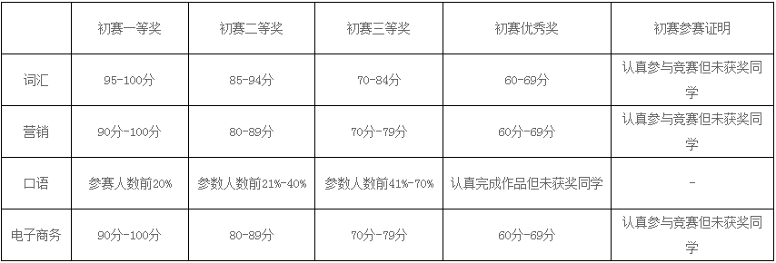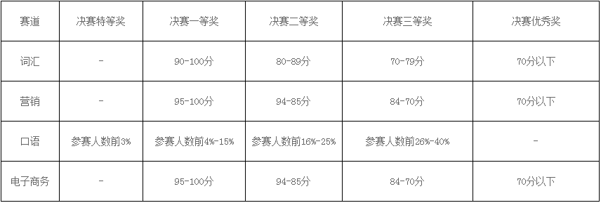 词汇赛道、营销赛道以及电商赛道获初赛一、二等奖选手可晋级决赛;口语赛道获初赛一等奖选手可晋级决赛。
