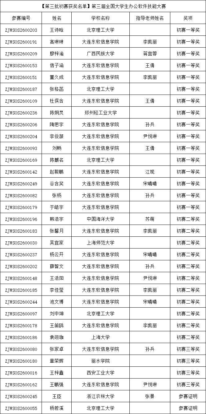 第三届全国大学生办公软件技能大赛自启动以来,持续得到全国各高校的广泛关注和广大学子的热情参与。经过系统自动阅卷与严格复核,现将第三批初赛获奖名单(截止2026年3月20日10:00)予以公布。