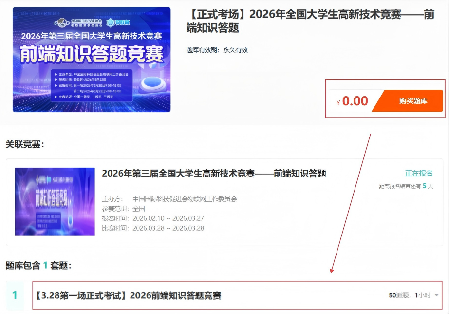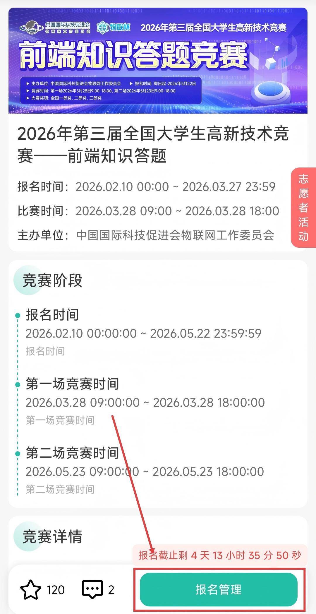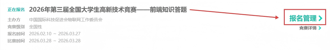 1、进入大赛官网: https://new.saikr.com/vse/WLBQD26 ,登录报名账号,找到2026年全国大学生高新技术竞赛——前端知识答题,点击【报名管理】