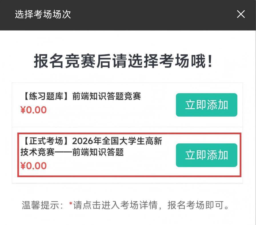 注:当前仅可添加正式考场,比赛正式开始时才可以进入正式考场答题。