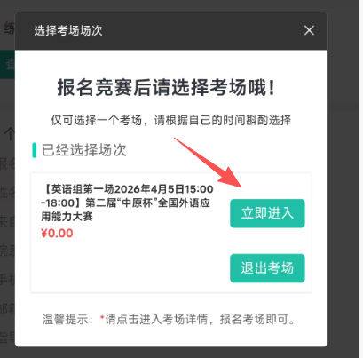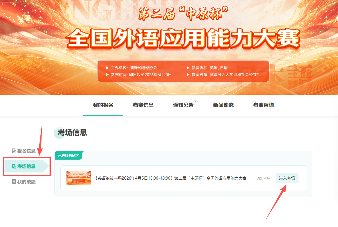 登录大赛官网-个人中心-我报名的竞赛-报名管理-考场信息-进入考场