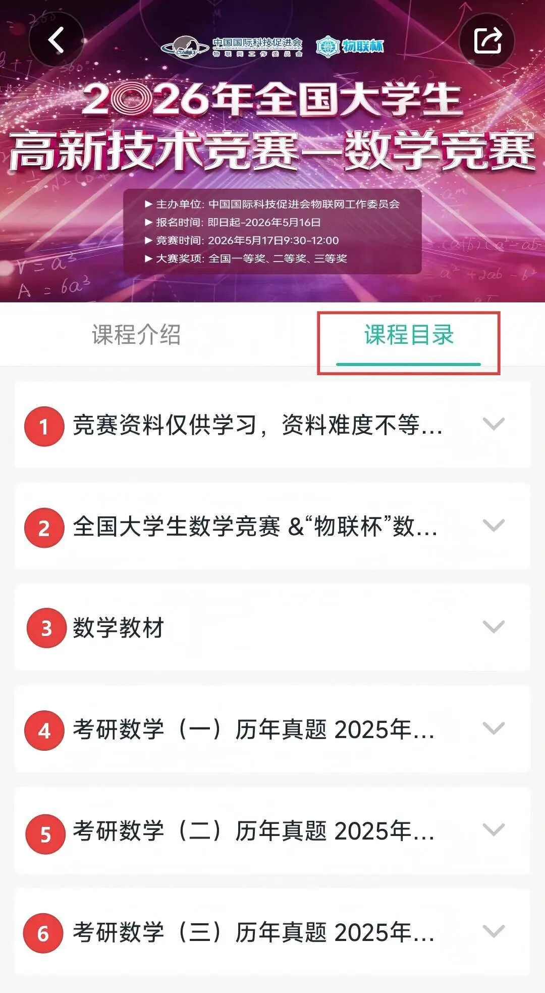 【第二步】:在新跳转页面点击课程栏,找到“【历年真题 | 免费自取】全国大学生高新技术——数学竞赛(资料仅供学习)”