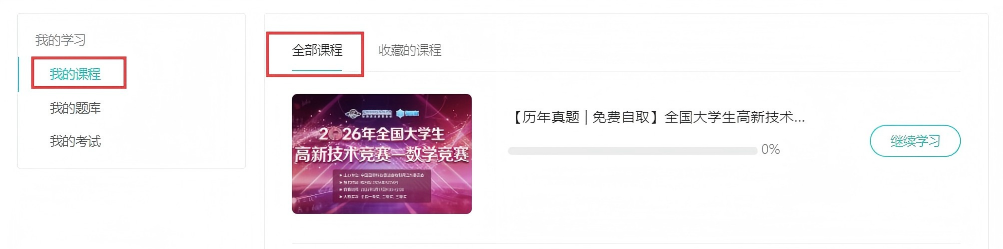 【第二步】:在【我的课程】一栏选择【全部课程】,点击“【历年真题 | 免费自取】全国大学生高新技术——数学竞赛(资料仅供学习)”