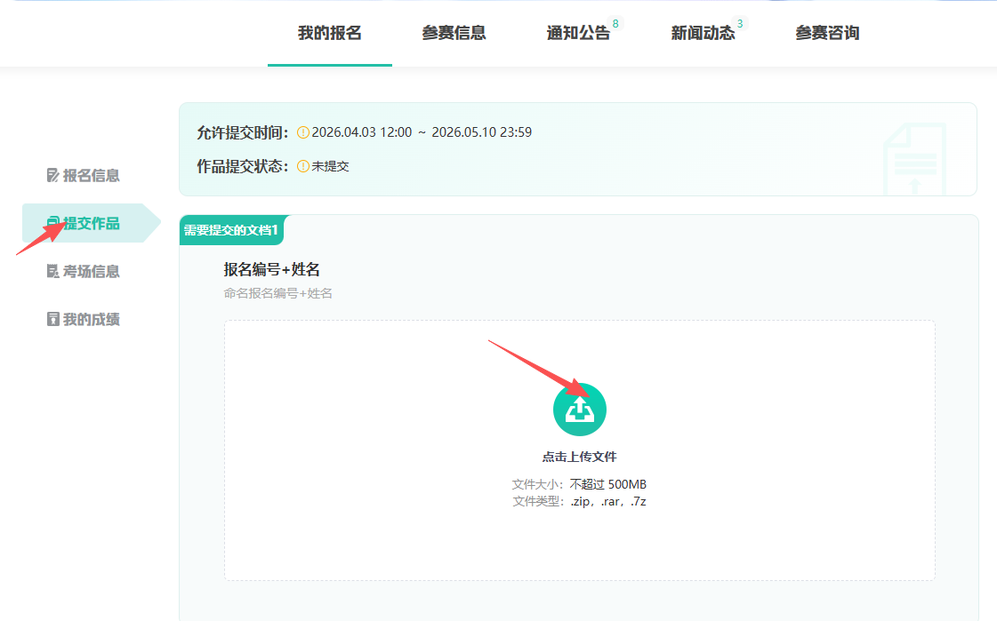 【报名管理】-【提交作品】-【上传文件即可】(第一场决赛时间4月3日12:00-1月10日23:59)