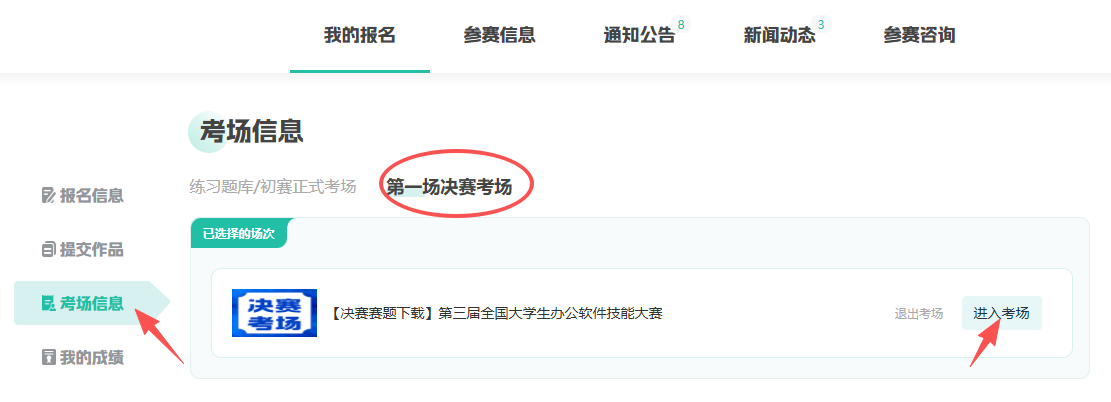 ②查看【考场信息】-【第一场决赛考场】-【进入考场】