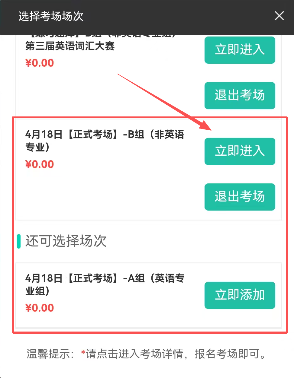 注:每人仅可进入考场一次,请确认好并进入考场!