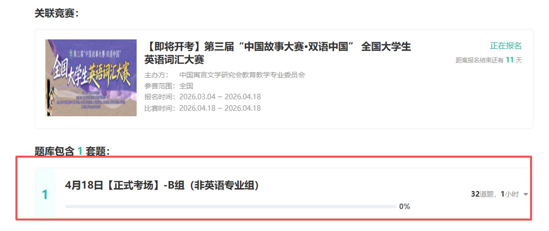 第三届“中国故事大赛·双语中国” 全国大学生英语词汇大赛——首场考试将于4月18日(周六)进行,同学们安排好自己的时间,详细考试流程及注意事项如下,请同学们参考准备!