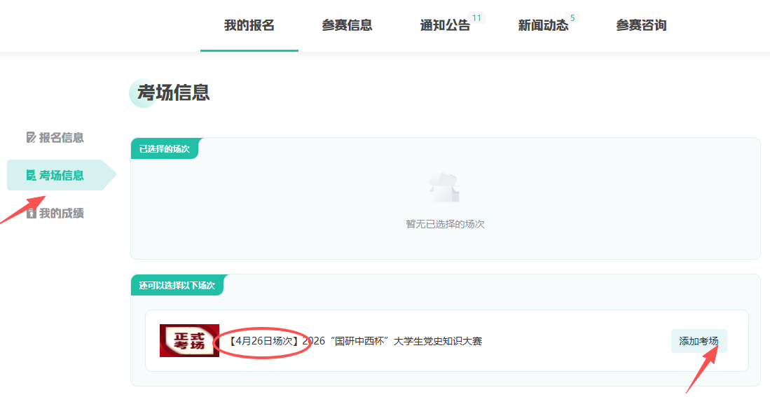 ③点击【考场信息】-找到【4月26日场次】-【添加考场】