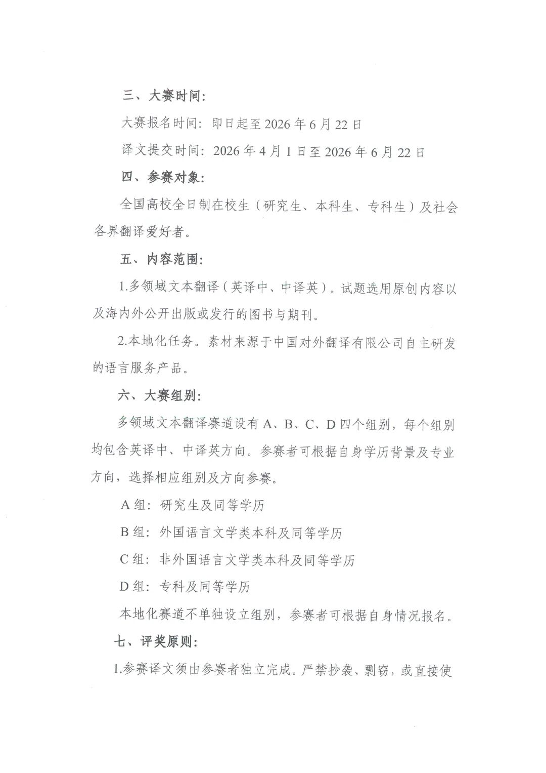 1、多领域文本翻译赛道设有A、B、C、D四个组别,每个组别均包含英译中、中译英方向。参赛者可根据自身学历背景及专业方向,选择相应组别及方向参赛。