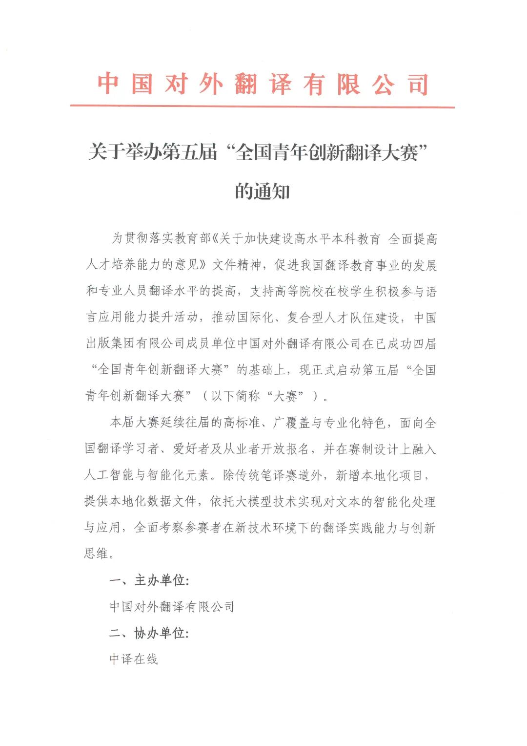 为贯彻落实教育部《关于加快建设高水平本科教育 全面提高人才培养能力的意见》文件精神,促进我国翻译教育事业的发展和专业人员翻译水平的提高,支持高等院校在校学生积极参与语言应用能力提升活动,推动国际化、复合型人才队伍建设,中国出版集团有限公司成员单位中国对外翻译有限公司在已成功四届“全国青年创新翻译大赛”的基础上,现正式启动第五届“全国青年创新翻译大赛”(以下简称“大赛”)。
