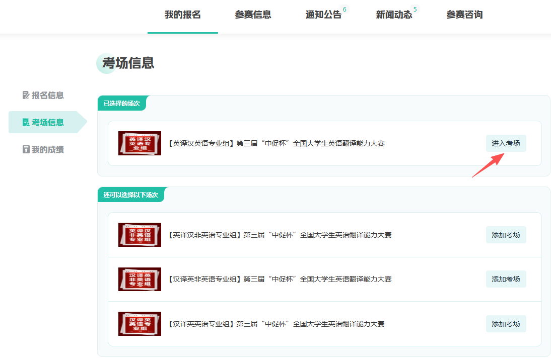 ③ 点击【考场信息】 → 找到【选择的组别】 → 点击【添加考场】→【进入考场】;