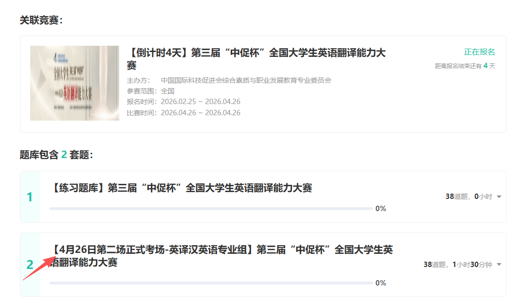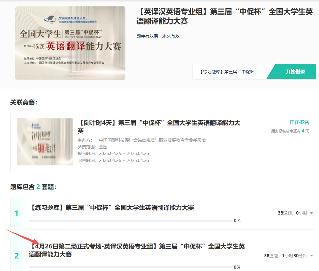 ④ 点击【4月26日第二场正式考场】即可开始考试(注:此处为进入考场操作,已报名选手直接进入即可),即可进入作答。【注意不要直接点开始做题,此处为练习题库 】