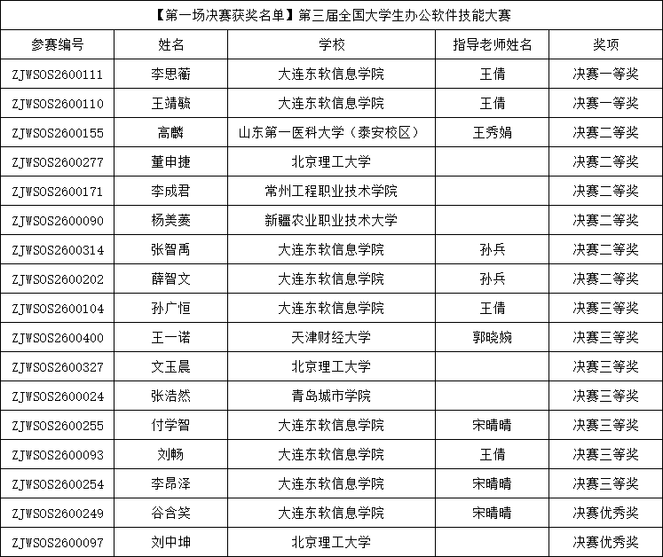 2026年全国大学生办公软件技能大赛第一场决赛已圆满结束。本次决赛采用综合应用操作题形式,涵盖文字处理、电子表格制作、演示文稿设计三类题型,重点考察选手在真实场景下的办公软件综合运用能力与实际问题解决能力。根据大赛规则,初赛成绩达到80分及以上的选手获得决赛资格。经严格评审,现将第一场决赛获奖名单予以公布。(见下方)