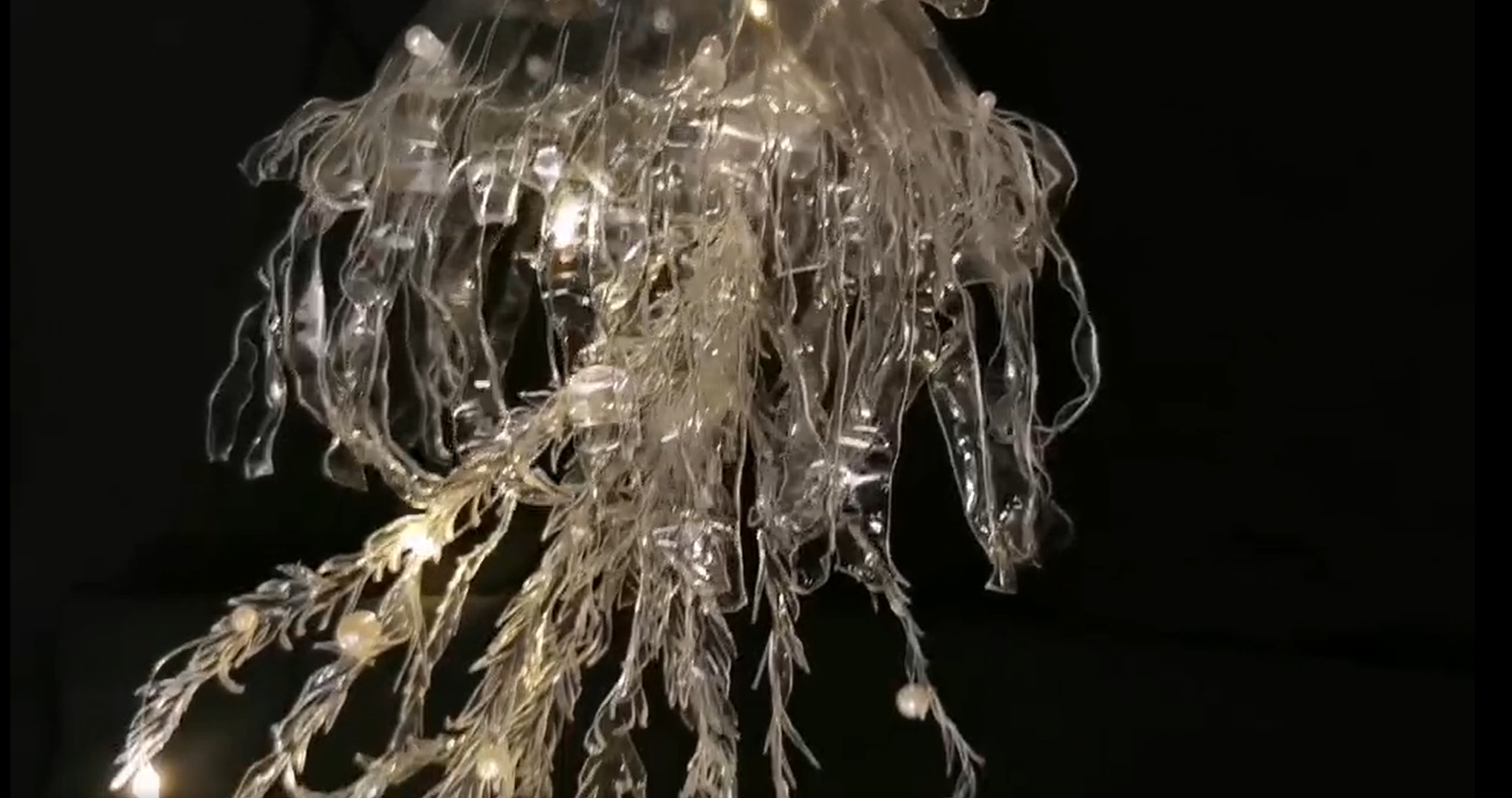 设计理念:该作品通过回收塑料瓶进行制作,呼应了环保的主题。制作过程中使用了多种加工方式,如涂、烧、剪、粘、扭。以常见的海月水母和涌浪为灵感,将塑料瓶分别剪成水母伞帽和触须的形状,再用蜡烛将其边缘烧至卷曲,从而达到拟态效果。再利用塑料珍珠、小灯泡、废弃指甲油制造波光粼粼的感觉;在黑暗中打开灯光,即可打造一个绚烂丰富且充满美感的海洋空间。