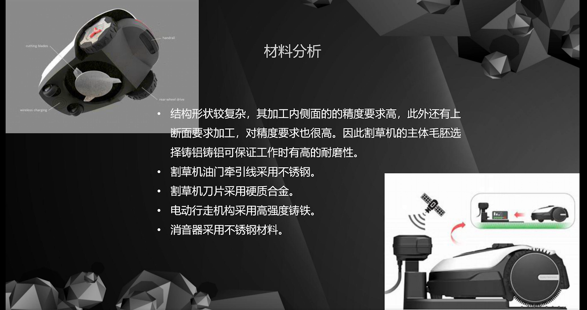 设计理念:通过机械装置实现自动割草,割草装置与车身一体,可以边行驶边割草,可自动升降,可适应不同类型的地面。