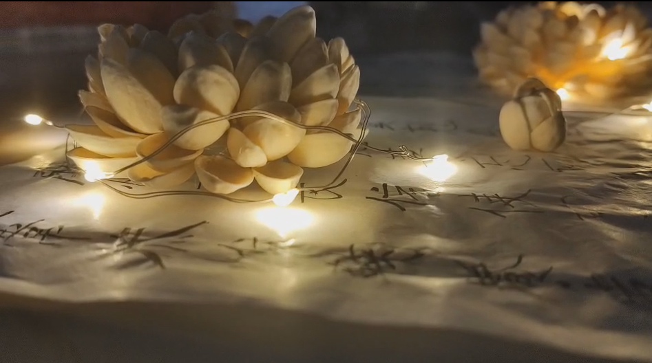 用吃过的开心果壳塑造成一朵朵莲花和花骨朵,再用上废弃的宣纸重塑书写意境,辅之以小灯,让其在幽暗的环境中显得更加具有意境。不仅让其成为一个摆件,更实现了废物利用,体现了环保的理念!