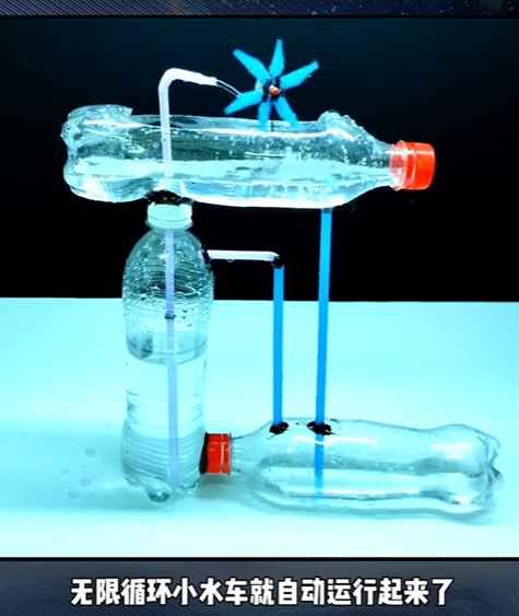 这是一个手工作品,主要是采用重力以及压强所产生的现象。工作原理是水的动能转移为水车的动能,它的本质是变相连通器。最下面的一号瓶子用水压空气进入二号瓶子,二号瓶子空气压缩水升到三号瓶子,当最下面瓶子没空气压力的时候,循环结束。