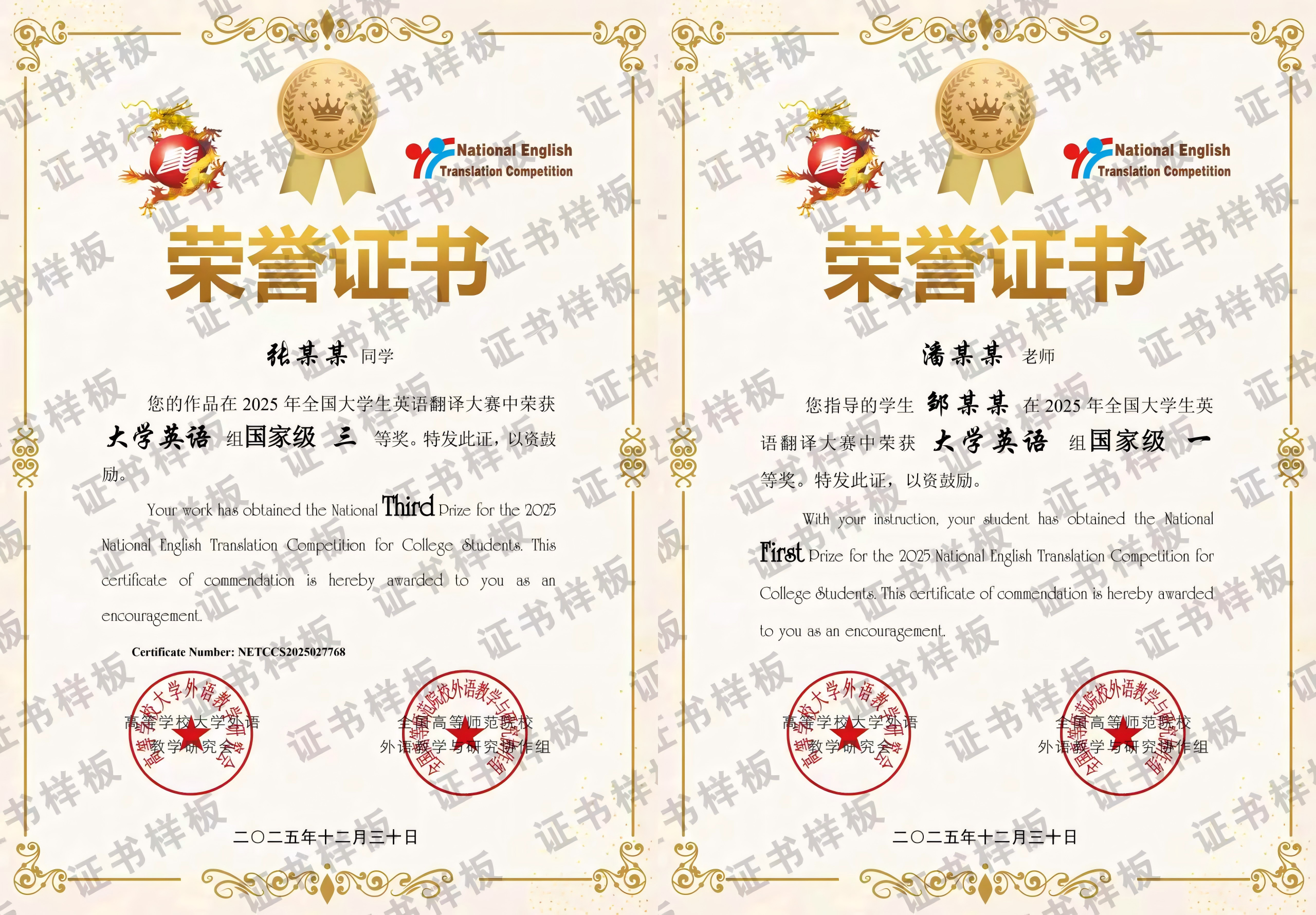 2. 获奖证书:获奖师生由全国英语翻译大赛组委会颁发纸质版获奖证书。