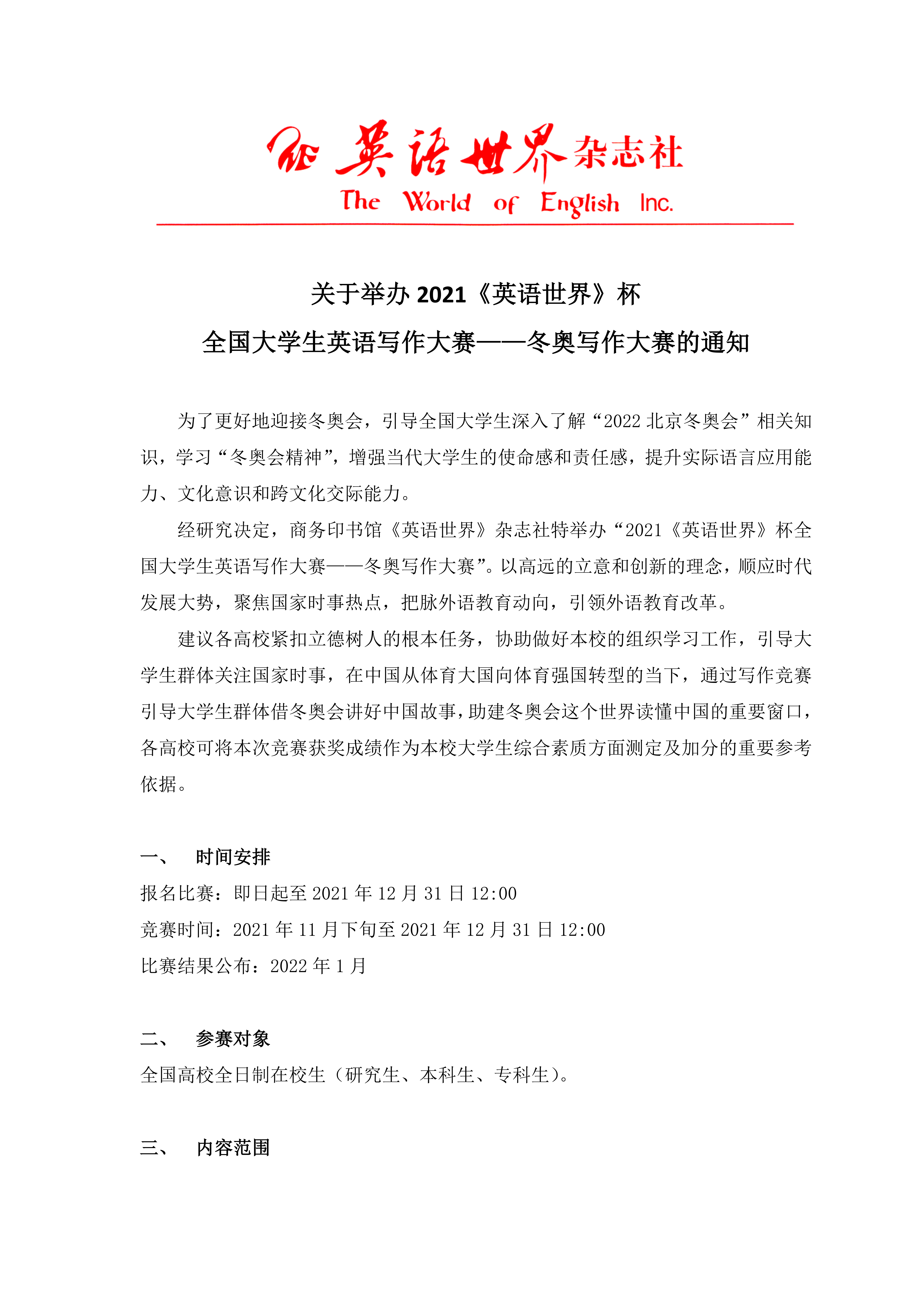 经研究决定,商务印书馆《英语世界》杂志社特举办2021《英语世界》杯全国大学生英语写作大赛——冬奥写作大赛。以高远的立意和创新的理念 , 顺应时代发展大势,聚焦国家时事热点,把脉外语教育动向,引领外语教育改革。