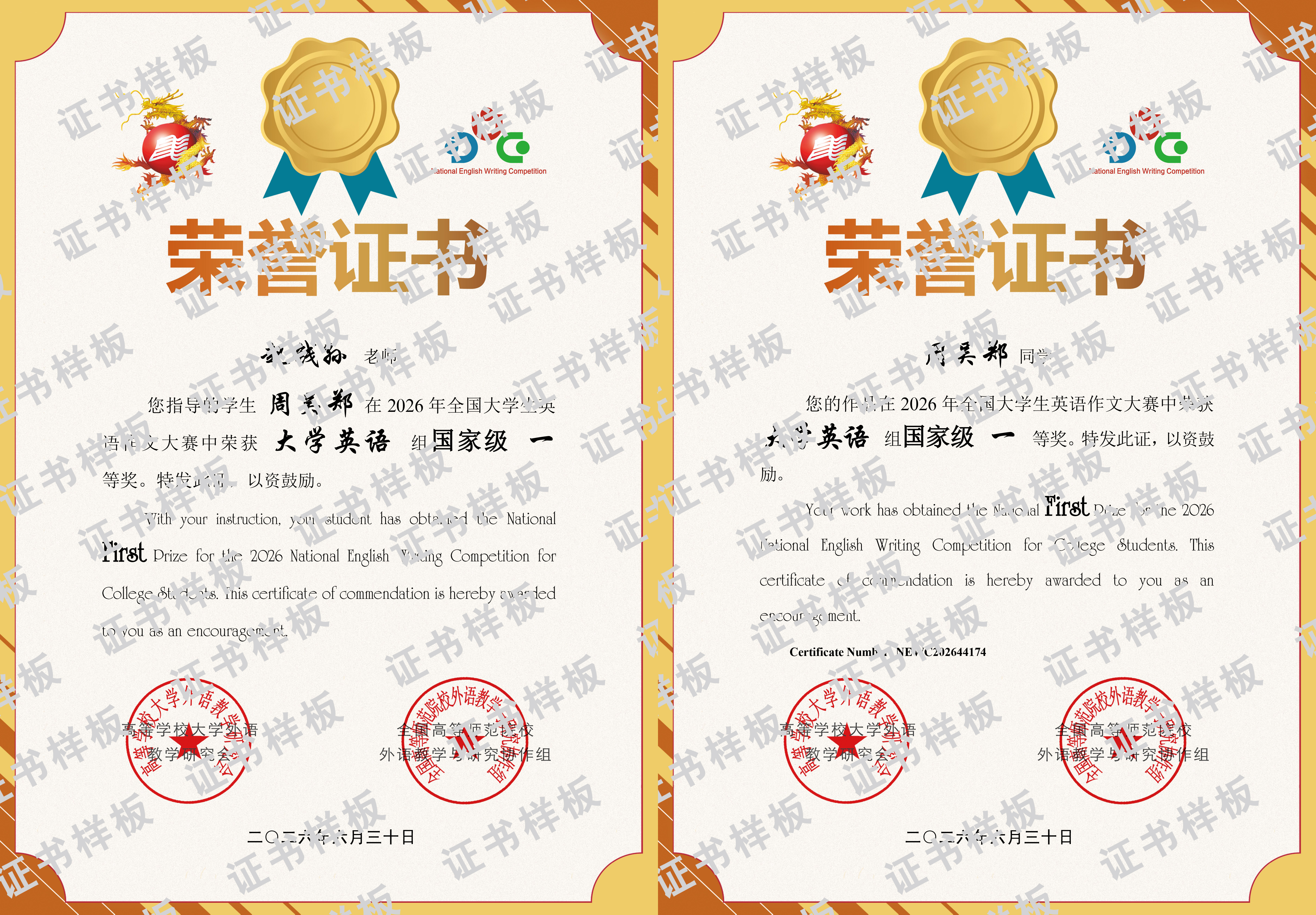 2. 获奖证书:获奖师生由全国英语作文大赛组委会颁发纸质版获奖证书。